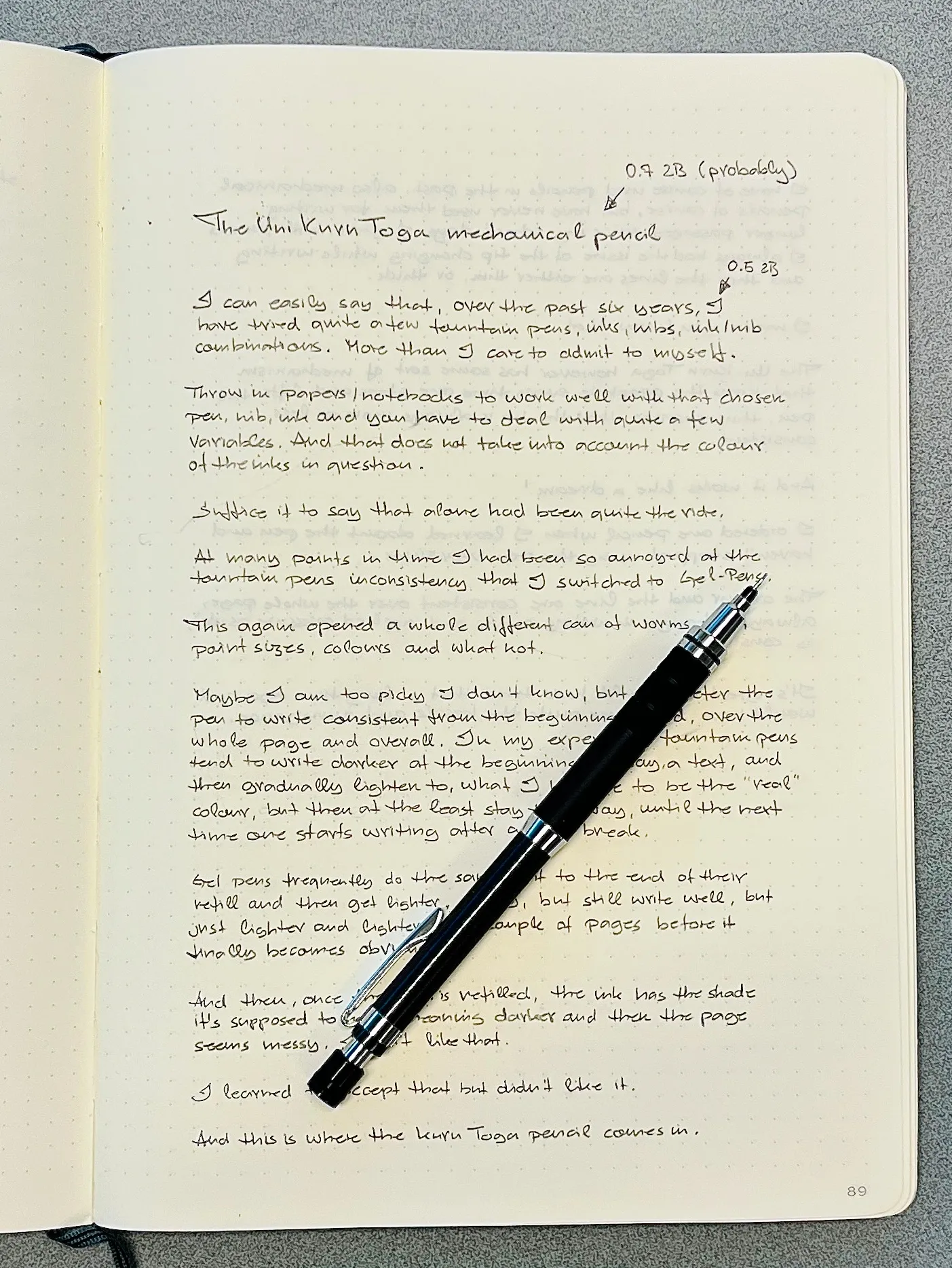The Uni Kuru Toga however has some sort of mechanism that the turns the graphite every time one stops writing or lifts the pen, thus ensures a consistent writing experience. When I learned about the pen I ordered one just to give it a try. Maybe it works.