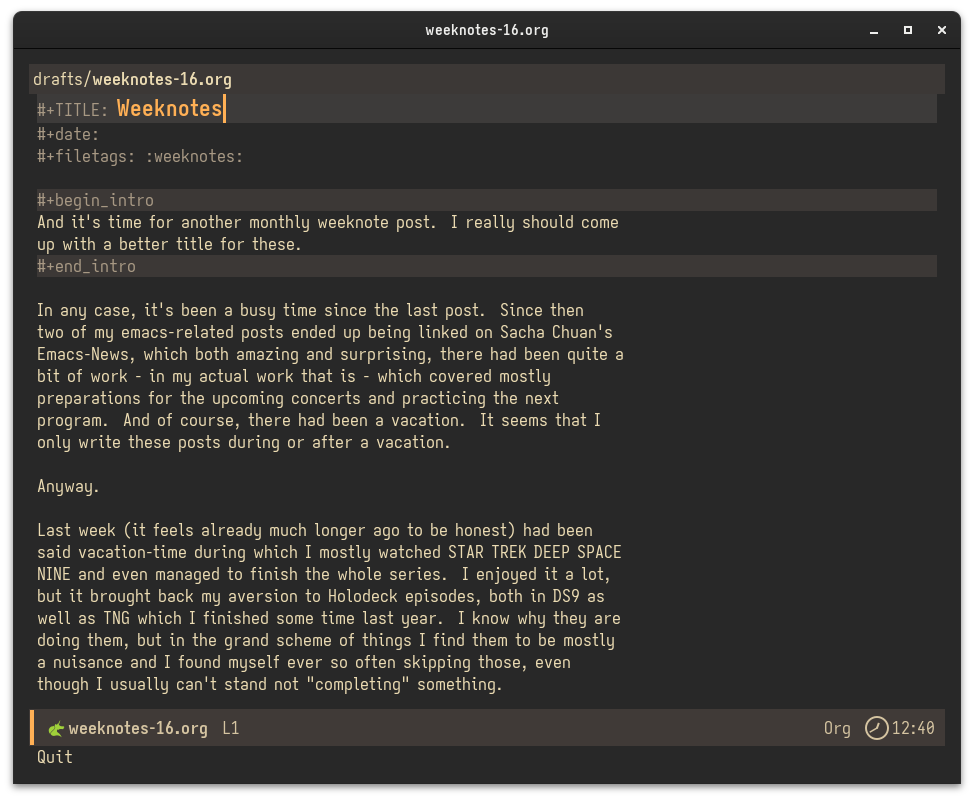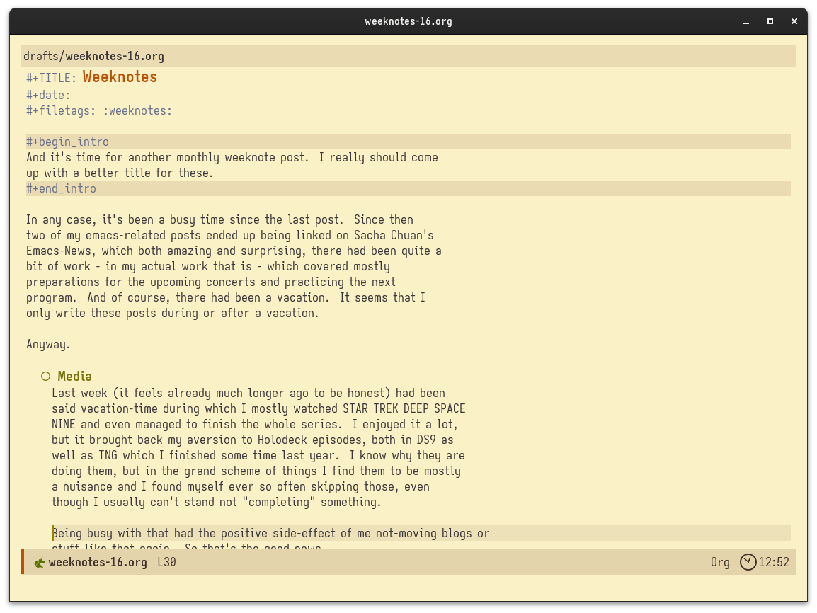 In any case, it's been a busy time since the last post. Since then two of my emacs-related posts ended up being linked on Sacha Chuan's Emacs-News, which both amazing and surprising, there had been quite a bit of work - in my actual work that is - which covered mostly preparations for the upcoming concerts and practicing the next program. And of course, there had been a vacation. It seems that I only write these posts during or after a vacation.