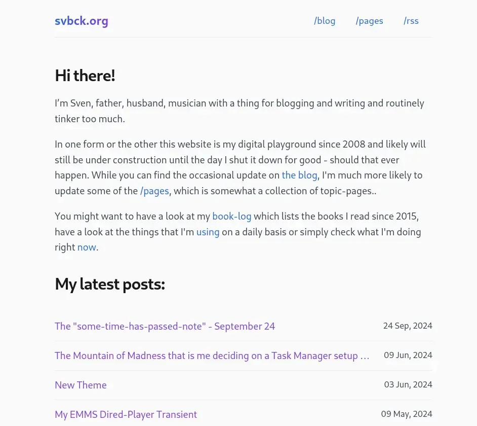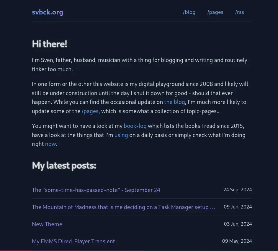 - I changed the theme of this blog to mgx's Koan theme and enjoy this a lot. In some ways it is similar to what I had build myself (and just realized that it would had been smart to actually take a screenshot of the "old" theme - but didn't) but here's one of the Koan theme in light and dark (should you read this in your RSS-reader and for the archives). And thanks to mgx for building this theme: